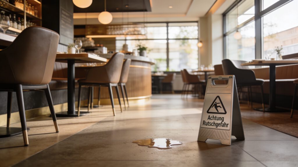 Ein klassischer Haftungsfall in der Gastronomie entsteht, wenn ein Gast auf einem frisch gewischten Boden, einer feuchten Eingangsfläche oder einem verschütteten Getränk ausrutscht. Kommt es dabei zu Verletzungen, können Behandlungskosten, Schmerzensgeld und weitere Schadenersatzforderungen im Raum stehen.